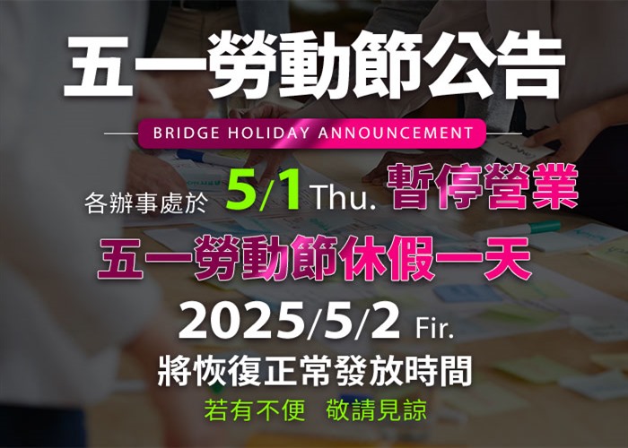 適逢國定五一勞動節日,貼心提醒您,全台辦公室將於5/1(四)暫停營業一天,5/2(五)恢復正常營業,出門在外要多多注意安全喔!