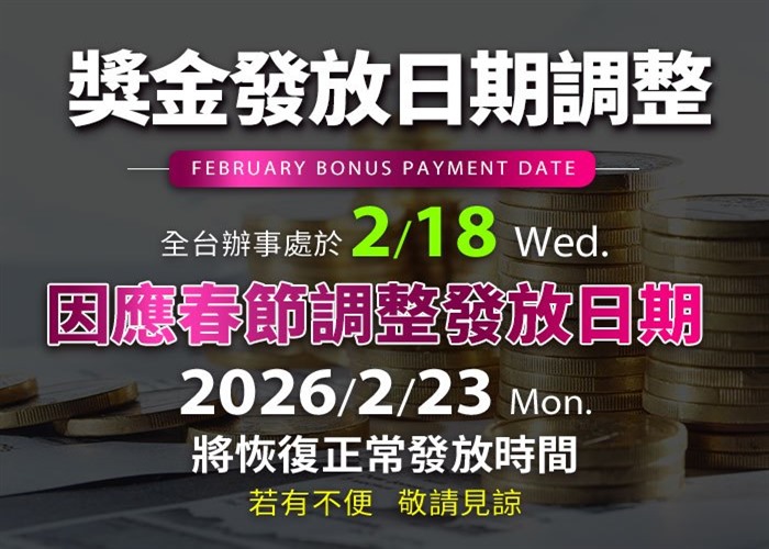 因適逢春節年假,2026/2/18(三)獎金發放時間將暫停發放一次,延後至2026/2/25(三)一併發放,煩請雲康世紀夥伴們注意此公告,如有疑問,請於本公司上班時間來電詢問哦!謝謝! 本公司電話 : 04-2475-5500。
